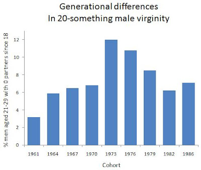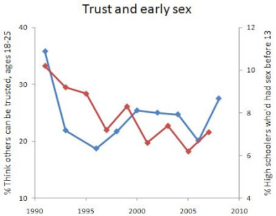 (I've looked at responses to this teenage sex question across all sorts of demographic groups, and aside from GSS respondents who are youngsters themselves, I haven't found a single group where the majority think it is OK, let alone one where one estimate puts them at over 60%. Very wild indeed.)